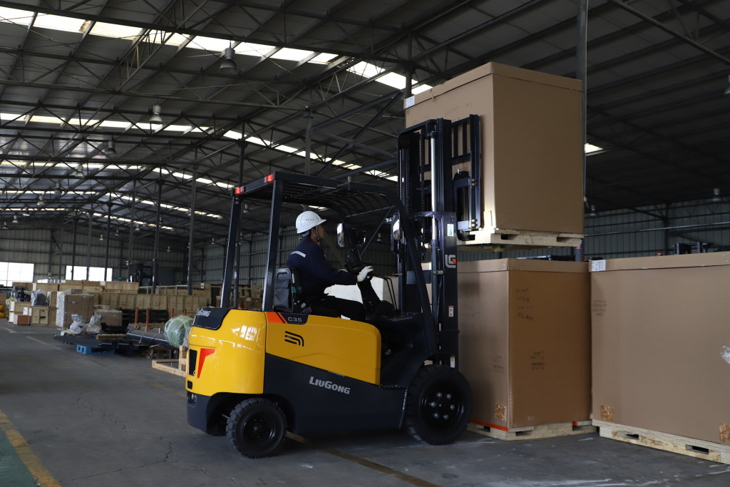 Электрический вилочный погрузчик LiuGong CLGA35-S с номинальной грузоподъемностью 3500 кг и с высотой подъема вил от 3 до 6 метров.