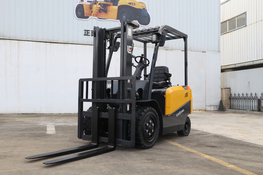 Электрический вилочный погрузчик LiuGong CLGA35-S с номинальной грузоподъемностью 3500 кг и с высотой подъема вил от 3 до 6 метров.